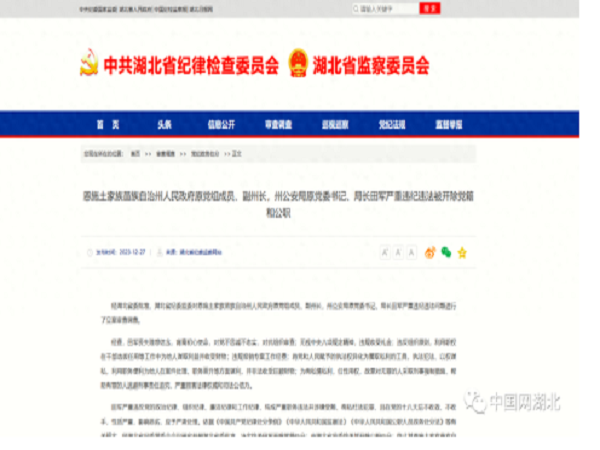 恩施土家族苗族自治州人民政府原黨組成員、副州長,州公安局原黨委書記、局長田軍嚴重違紀違法被開除黨籍和公職
