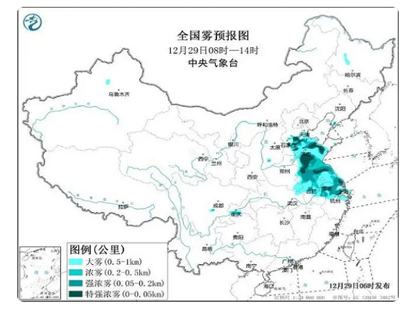 中國天氣網訊 中央氣象臺12月29日06時發布大霧紅色預警: