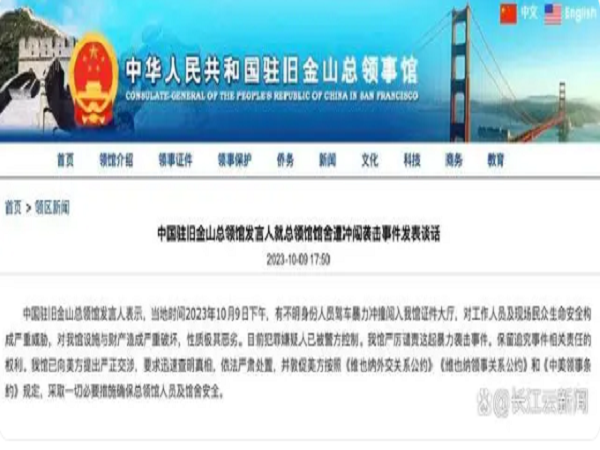中國駐舊金山總領館發言人表示,當地時間2023年10月9日下午,有不明身份人員駕車暴力沖撞闖入我館證件大廳,對工作人員及現場民眾生命安全構成嚴重威脅,對我館設施與財產造成嚴重破壞,性質極其惡劣。目前犯罪嫌疑人已被警方控制。