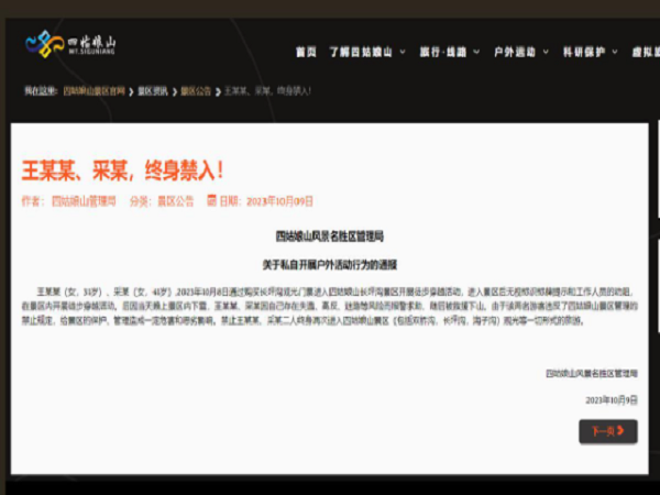 10月9日,四姑娘山景區管理局發布通報稱,兩名女游客不聽工作人員勸阻,在景區內開展徒步穿越涉險,隨后被救援下山,因兩人違反景區管理的禁止規定,禁止她們再次進入四姑娘山景區觀光旅游。