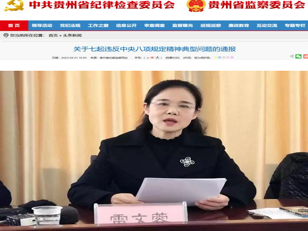 貴州省紀委監委網站9月21日公開通報通報七起違反中央八項規定精神典型問題。其中包括貴州省科學技術協會原黨組成員、副主席雷文蓉違規收受禮品、禮金,接受可能影響公正執行公務的宴請問題。