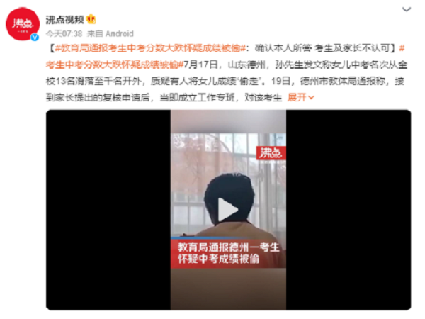 7月17日,山東德州,孫先生發文稱女兒中考名次從全校13名滑落至千名開外,質疑有人將女兒成績“偷走”。