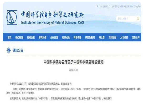 根據《國務院辦公廳秘書局關于印發國務院機構簡稱的通知》(國辦秘函〔2023〕18號),國務院辦公廳秘書局對我院簡稱作了修訂,修訂后簡稱為中國科學院。請各單位、各部門知悉,并在工作中使用。