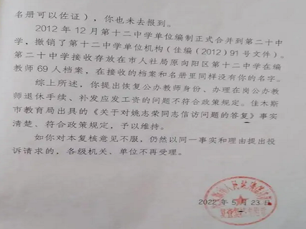 2020年,在退休前夕,原黑龍江佳木斯向陽區第十二中學(下稱“第十二中學”)教師姚志榮發現,自己的教師編制“消失”了。