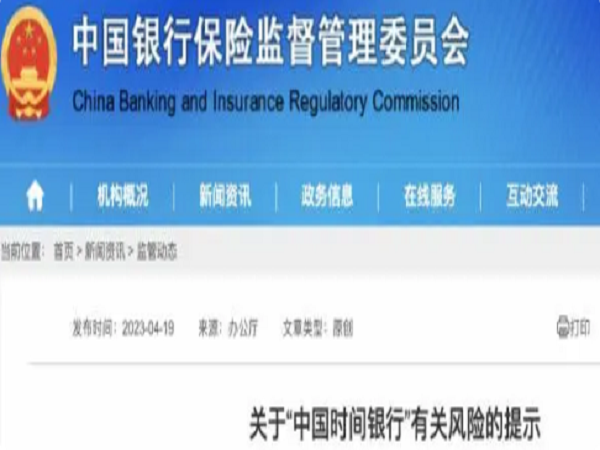 4月19日,銀保監會發布風險提示,近期銀保監會通過日常監測發現,個別網站發布“中國時間銀行上市”等虛假信息,且有名為“時間銀行”的移動應用程序(APP)以公益養老為名目開展投資活動。