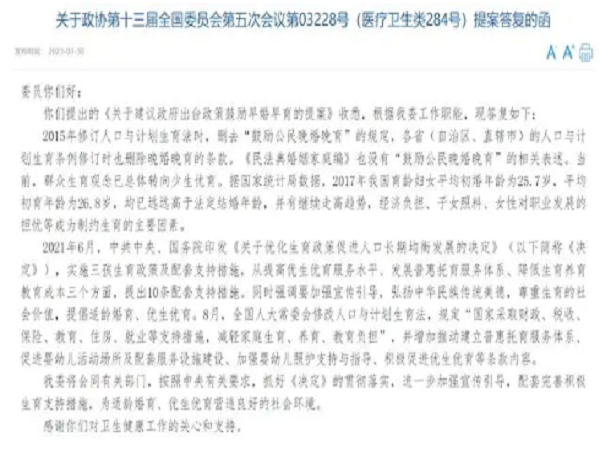 對于全國政協委員提出的《關于建議政府出臺政策鼓勵早婚早育的提案》,國家衛生健康委官網日前公開相關答復。國家衛健委在答復中指出,2015年修訂人口與計劃生育法時,刪去“鼓勵公民晚婚晚育”的規定,各省(自治區、直轄市)的人口與計劃生育條例修訂時也刪除了晚婚晚育的條款