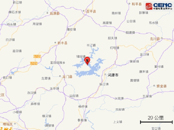 據中國地震臺網正式測定,3月8日5時15分在廣東河源市東源縣發生4.5級地震,震源深度10公里,震中位于北緯23.84度,東經114.52度。
