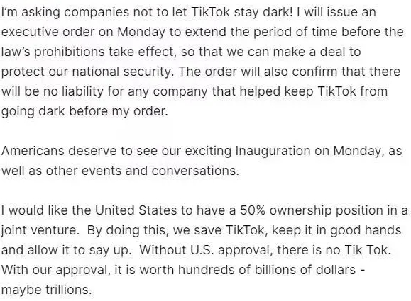 特朗普:將于1月20日簽署行政令避免在美關停TikTok