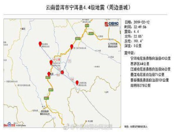 云南寧洱地震4.4級 震中距寧洱縣43公里有震感