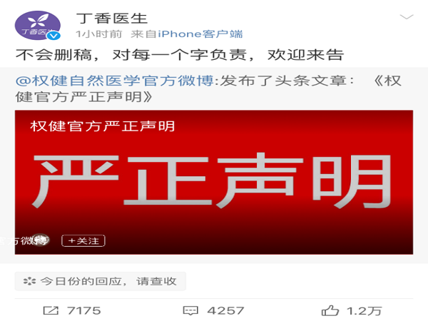 12月26日,輿論漩渦中的權健在其官方公號權健自然醫學公號上,發表嚴正聲明,稱“丁香醫生”微信號發布的文章《百億保健帝國權健,和它陰影下的中國家庭》不實,指責其“利用從互聯網搜集的不實信息,對權健進行誹謗中傷,嚴重侵犯權健合法權益,致使社會大眾對權健品牌造成曲解。”