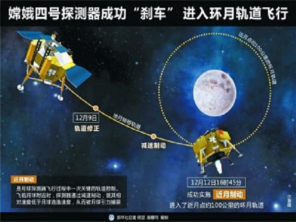 12月12日16時45分,嫦娥四號探測器經過約110小時奔月飛行,到達月球附近,成功實施近月制動,順利完成“太空剎車”,被月球捕獲,進入了近月點約100公里的環月軌道。