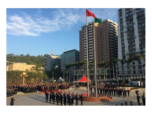 12月20日清晨,澳門特區政府與駐澳門部隊分別舉行升國旗儀式,慶祝澳門回歸祖國18周年。 ??今天的金蓮花廣場花團錦簇,澳門紀律部隊整齊列隊,觀禮團有序排列,靜待莊嚴的升旗儀式,共同慶祝澳門回歸祖國18周年。 ??八時整,特警儀仗隊護送國旗、區旗進場。澳門警察銀樂隊奏響中華人民共和國國歌,鮮艷的五星紅旗與澳門特別行政區區旗冉冉升起。出席儀式的澳門各界人士、觀禮的