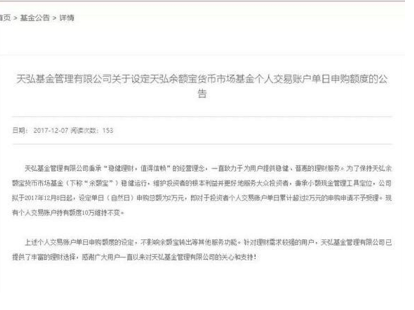 余額寶又“限購”了,這已經是年內第三次“限購”。 ??天弘基金12月7日晚間宣布,將余額寶單日(自然日)申購額度調為2萬元,即對于投資者個人交易賬戶單日累計超過2萬元的申購申請將不予受理。該措施將于12月8日零時起實施。 ??天弘基金稱,此舉是為了保持余額寶的穩健運行,維護投資者的根本利益。同時,余額寶現有10萬元個人交易賬戶持有額度的規定不變,此外,這次調整也