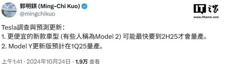 郭明錤:特斯拉Model Y更新版預計明年Q1量產,更便宜新車最快下半年