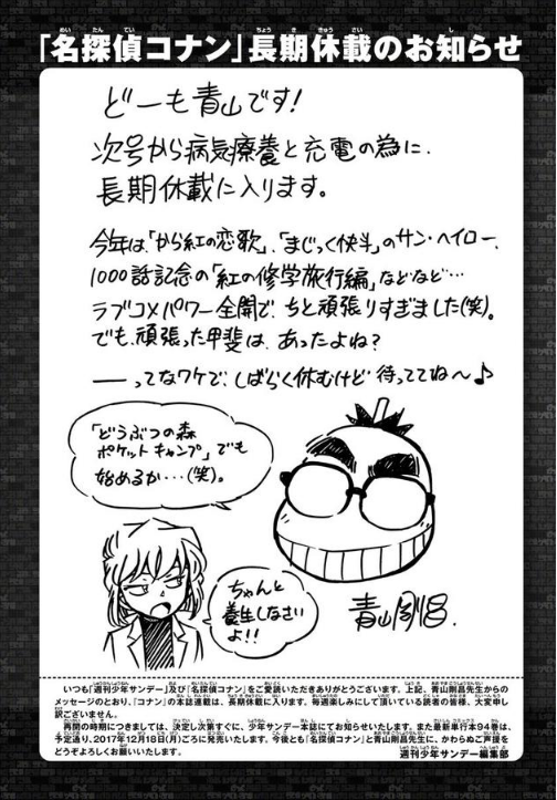 12月11日,名偵探柯開始長期休載!青山剛昌寫道:“大家好我是青山剛昌!從下一期開始,因為養病、充電,柯南進入長期休刊。今《唐紅的戀歌》、《魔術快斗》、《紅色修學旅行篇》等等…愛情喜劇能量全開,有點努力過頭了吧,但是,努力的成果是值得的吧?所以我要暫時休息一下!”