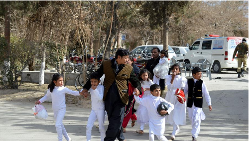 新華社伊斯蘭堡12月17日電(記者劉天)在巴基斯坦奎達,一名男子幫助兒童撤離爆炸現場。巴基斯坦西南部俾路支省首府奎達一座教堂17日遭襲,現場發生爆炸和激烈交火,已有至少8人死亡。"伊斯蘭國"宣稱對教堂襲擊案負責。