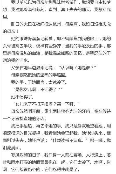 這篇文章是高中組一等獎作品,出自東陽中學高二(16)班申屠佳穎之手,她寫了自己和因車禍而腦損傷的母親之間的故事。錢報教育微信“升學寶”昨天推送了這篇作文,迅速破了10萬+,網友們留下了感人肺腑的留言。