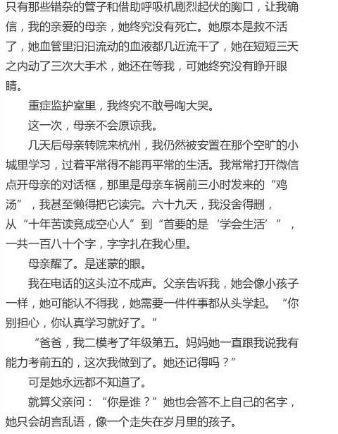 對申屠佳穎來說,母親就像喝了孟婆湯,她在作文里這樣寫道:“我常常打開微信點開母親的對話框,那是母親車禍前三小時發來的‘雞湯’,我甚至懶得把它讀完。六十九天,我沒舍得刪……一共一百八十個字,字字扎在我心里。”