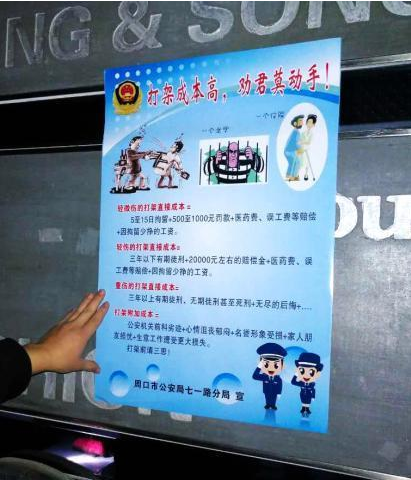 針對這一情況周口市七一路公安分局在轄區張貼“打架成本清單”,以直觀、簡單、通俗的形式總結計算出打架的經濟、法律成本算式,制作成“打架成本清單”。