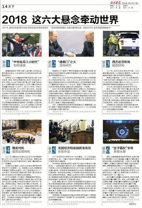 新華社北京1月2日電2017年,世界經濟復蘇勢頭向好,而政治安全形勢依舊復雜。一些舊問題得到解決,但新問題不斷出現。展望2018年,世界將面臨哪些懸念?