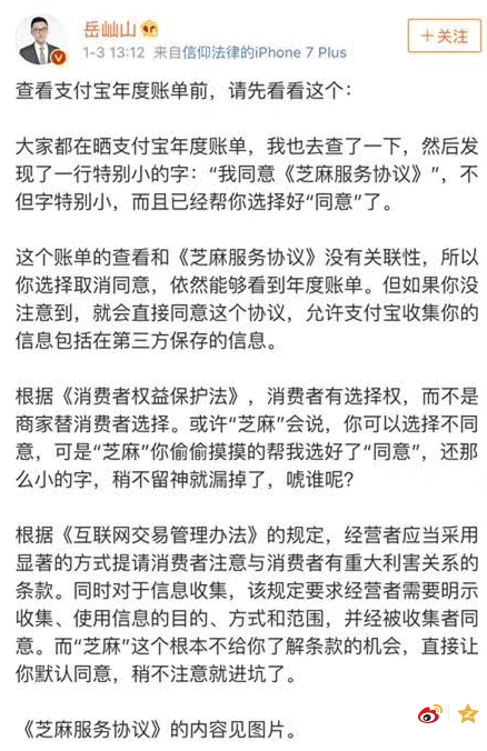 當天下午,知名律師、北京市岳成律師事務所高級合伙人岳屾山發文指出,賬單首頁一行特別小的字“我同意《芝麻服務協議》”存在風險。如果你沒注意到,就會直接同意協議,允許支付寶收集你的信息,包括在第三方保存的信息。“‘芝麻’信用不給用戶了解條款的機會,直接讓默認同意,該賬單或有侵犯消費者選擇權之嫌。