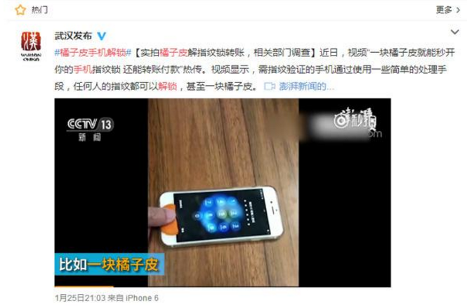 據央視報道,近日,網上一篇《一塊橘子皮就能秒開你的手機指紋鎖 還能轉賬付款》的文章及視頻引起了廣泛的關注。里面提到,對于需要指紋驗證的手機,通過使用一些簡單的處理手段,任何人的指紋都可以解鎖,甚至一塊橘子皮都行。據了解,目前工信部、質檢總局等相關部門已介入調查。