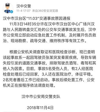 漢中公交車失控致2死5傷 系公交司機突發暈厥疾病所致