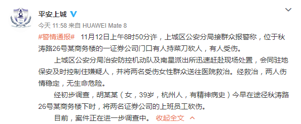經初步調查,胡某某(女,39歲,杭州人,有精神病史)今早在途徑秋濤路26號某商務樓下時,將兩名證券公司的上班員工砍傷。目前,案件正在進一步調查中。(完)