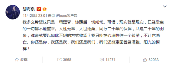 11月28日晚,胡海泉再次發聲表示:“我多么希望這只是一場噩夢,驚醒后一切如常。可惜,現實就是現實,已經發生的一切都不能重來。人性無常,人世滄桑。同行二十年的伙伴,共建二十年的羽泉,難道就要以如此不堪的方式收場?我只能在心底憋住一個希望,不讓它消亡。你還是你,我還是我,我們還是我們,我們還能重回曾經灑脫、陽光的模樣! ”