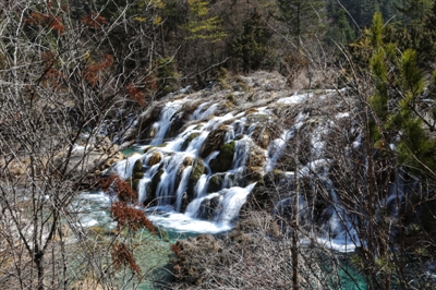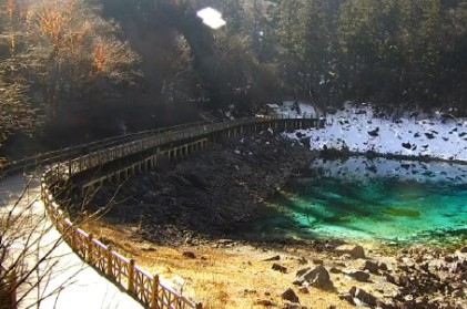 現在正是五彩池的枯水季節,水量不是很大,但冬春雪季中,五彩池依然沒有結冰,游覽者都大呼驚奇。工作人員介紹,五彩池最大的看點是看水,五彩池是九寨溝中最小最艷麗的海子,豐水期水面會上升三到五米。據悉,地震中,五彩池也沒有受到什么影響。