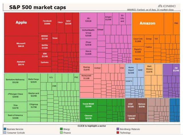 蘋果和亞馬遜目前各占到整個標普500指數總市值的4%左右。以下是亞馬遜的市值與標準普爾500指數中其他股票的比較: