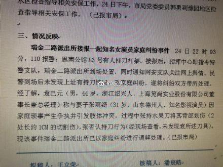 26日,網曝一則派出所案件處理截圖,據截圖文字描述,知名演員張雨綺和丈夫袁巴元發生肢體沖突,過程中張雨綺持水果刀將丈夫背部劃傷。目前,相關派出所已以家庭糾紛進行調解處理。就此消息,有媒體致電張雨綺方工作人員,但對方未接電話。