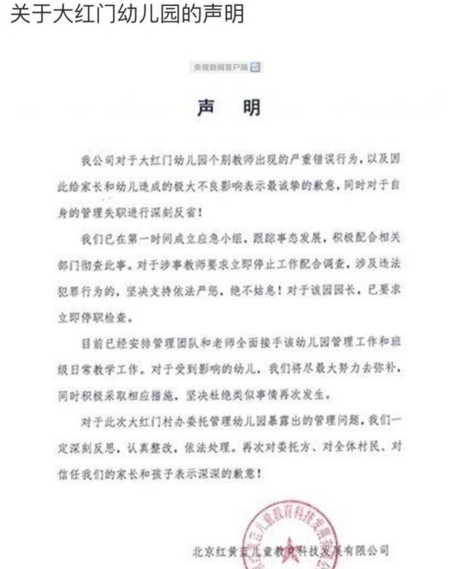 紅黃藍教育機構的官方微博賬號今年4月20日13點57分曾經發出一條帖子,就北京市大紅門幼兒園“個別教師出現的嚴重錯誤行為”發表了聲明,這份聲明中提到紅黃藍教育機構對涉事教師要求立即停止工作配合調查,大紅門幼兒園園長被立即停職檢查。