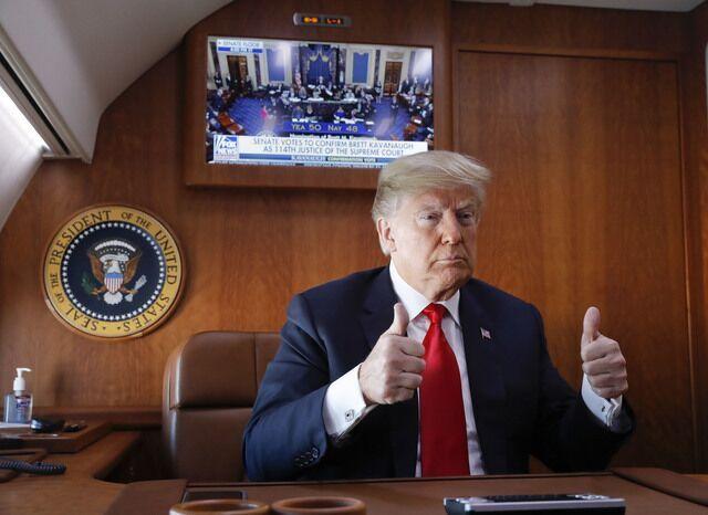 參院以50票贊成48票反對通過卡瓦諾的提名案后,在空軍一號上觀看投票結果的美國總統特朗普立刻雙手舉起大拇指讓媒體拍照。